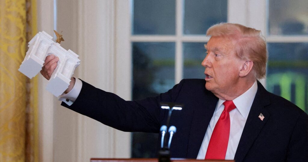 President Trump waved a model of an arch that he wants to have built at the ceremonial entrance to Washington, D.C., by the nation’s 250th anniversary next year.